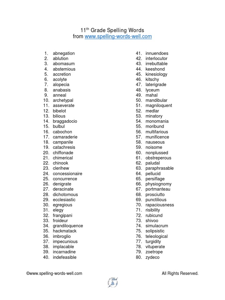 Vocabulary.com has compiled this collection of spelling words for students in 11th grade. The grade 11 spelling word list has definitions and examples, and it is supported by lots of online. Practice our 11th grade spelling words or make your own spelling list. Test your vocabulary in spelling tests for grade eleven. The page presents 11th grade spelling vocabulary (1).