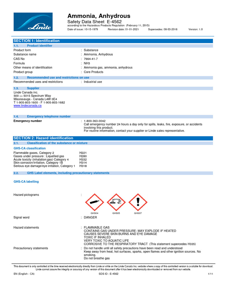 E 4562 Ammonia Anhydrous Safety Data Sheet Sds Download Free PDF