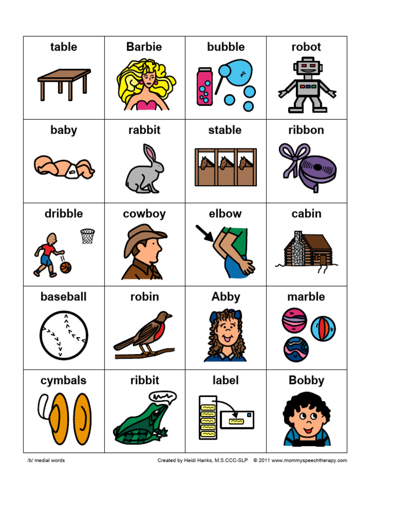 B Medial Words - List of words that have the / b / sound somewhere in the middle of the word Find a list of words with medial /b/ sound in different lengths, from 3 to 10 letters.