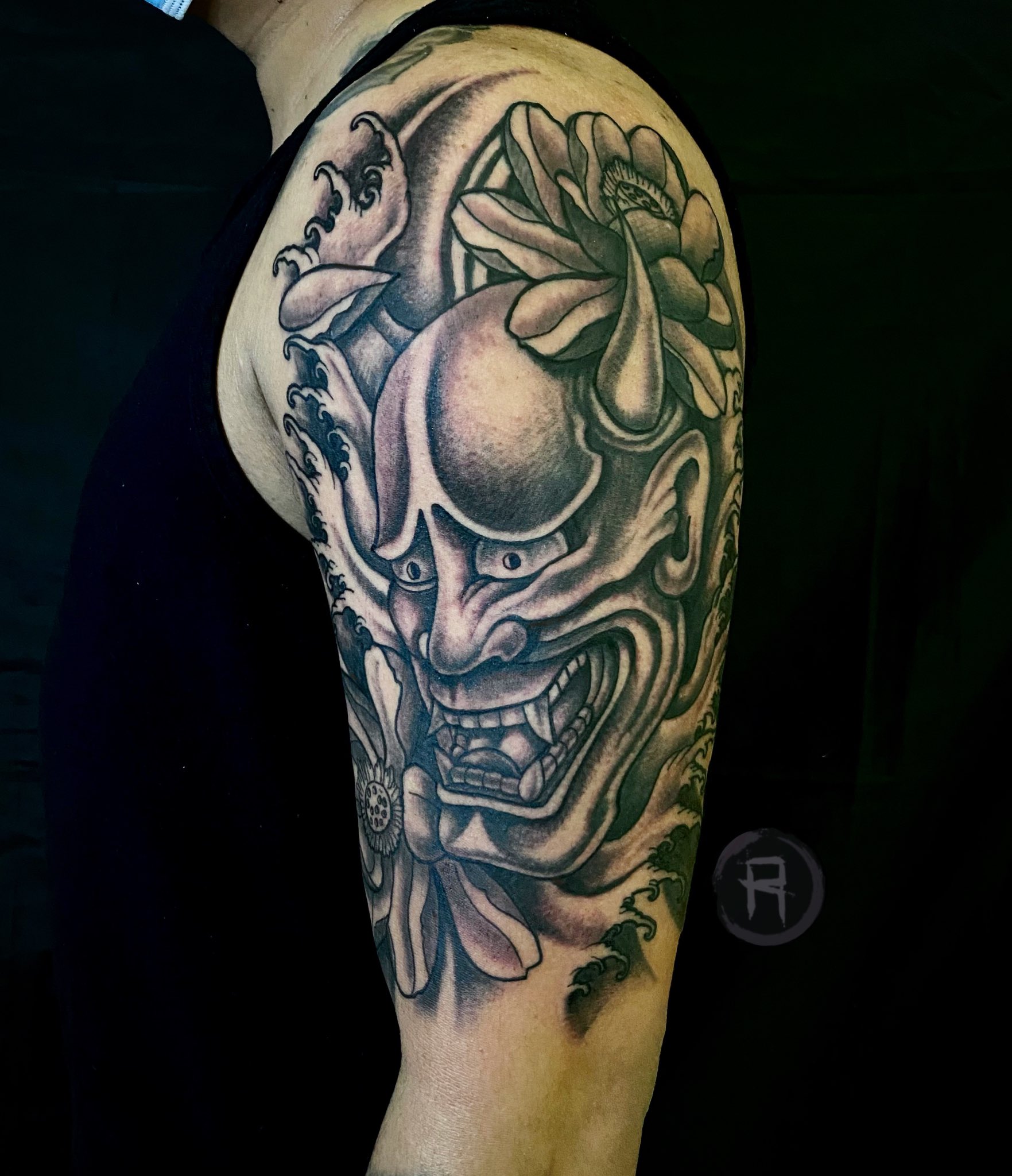Neo japanese oriental hannya mask and smoke black and grey tattoo done