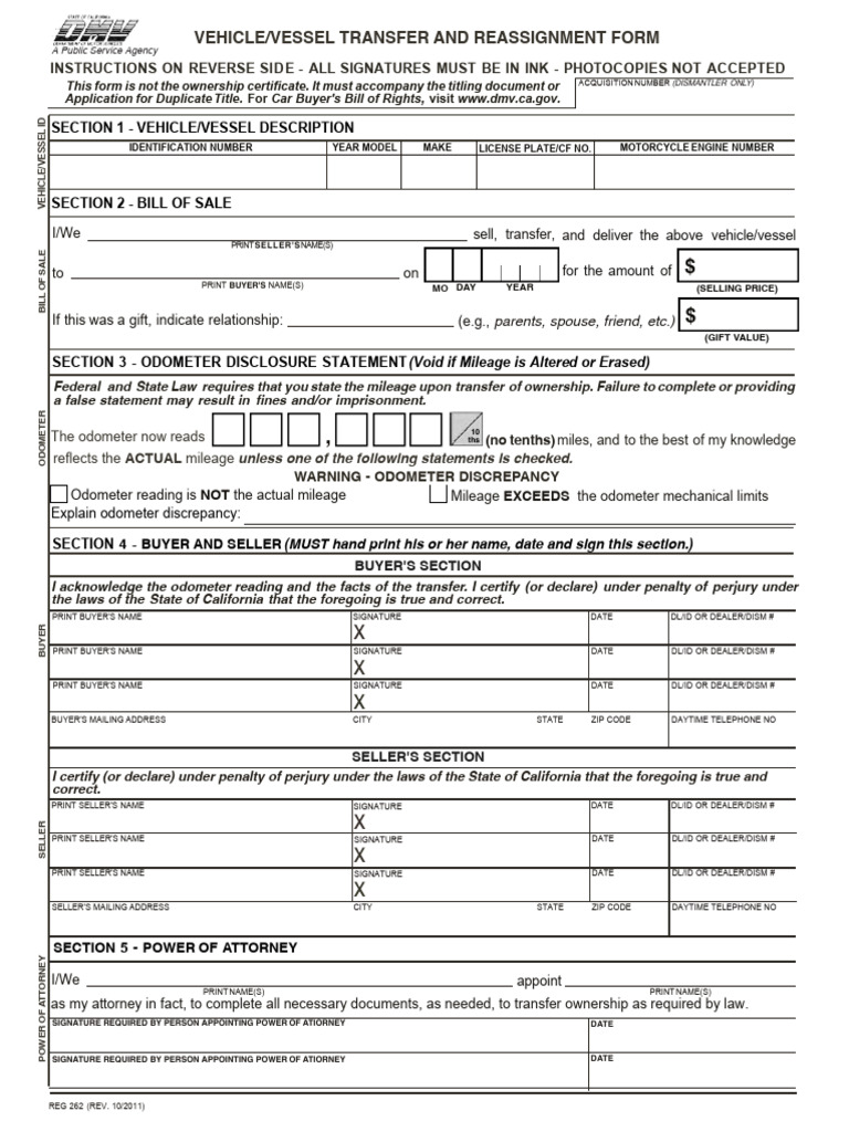 Filling out and using the california form reg 262, known as the vehicle/vessel transfer and. The california department of motor vehicles (dmv) requires that this information is printed.