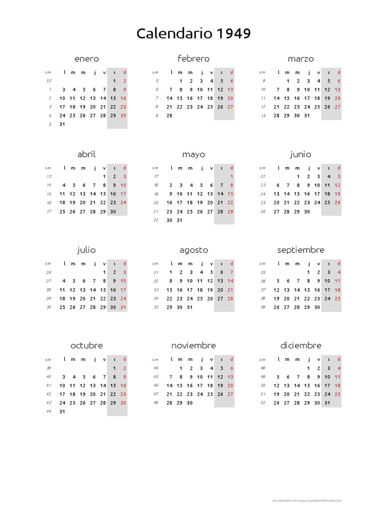 Opciones de configuración por país y año. Calendario 1949 con los días festivos y fechas importantes de españa. Enero 1949 53 1 2 3 4 5 lunes martes miércoles jueves viernes sábado domingo año nuevo 1 2. Incluye días festivos y feriados.
