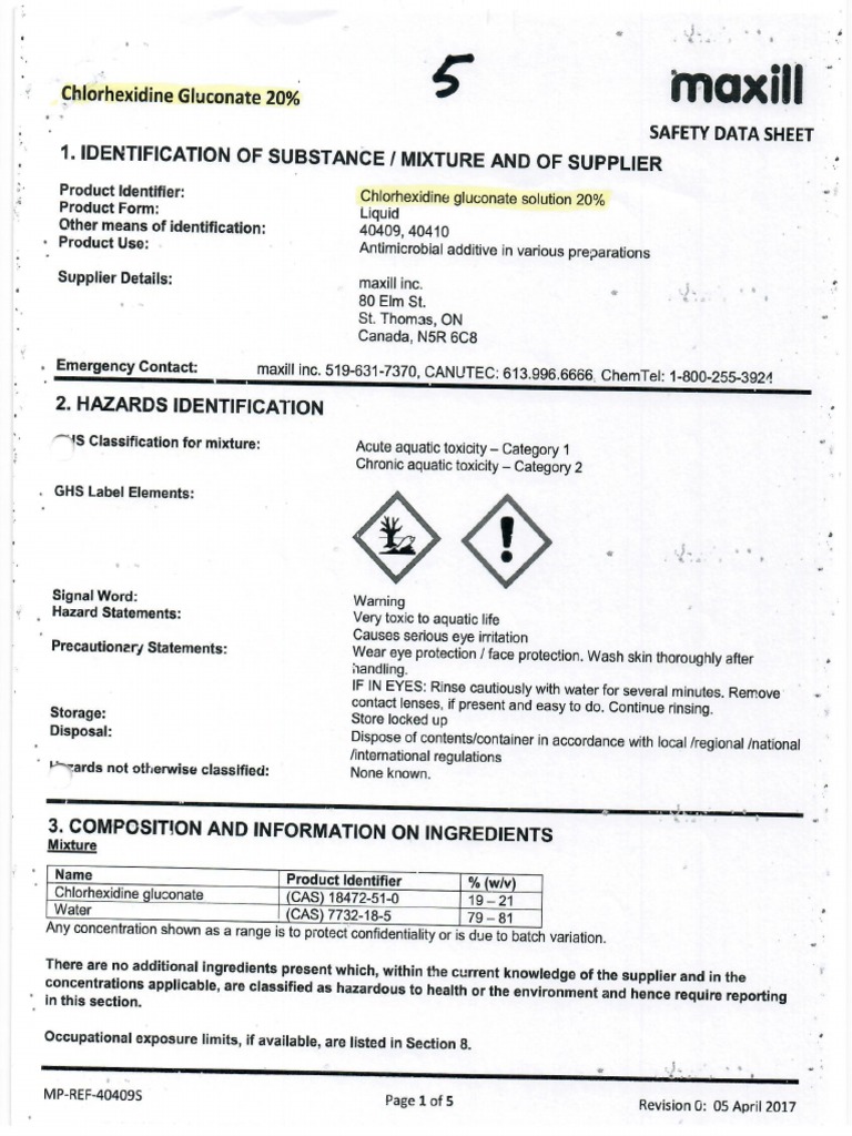 Safety data sheet chlorhexidine (20%) formulation version 2.2 revision date: This document has been prepared in accordance with standards for workplace safety, which require the inclusion of all known hazards of the active. Safety data sheet according to regulation (ec) no. The information provided in this safety data sheet is correct to the best of our knowledge, information and belief.