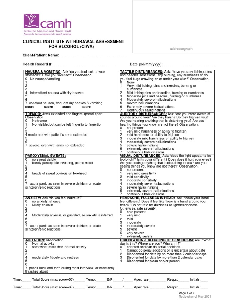 This assessment for monitoring withdrawal symptoms requires approximately 5 minutes to administer. Do you hear anything that disturbs you or that you know isn’t there?” ask, “what day is this? Each criterion is rated on a scale from 0 to 7, except for “orientation and clouding of. Assess and rate each of the 10 criteria of the ciwa scale. The.