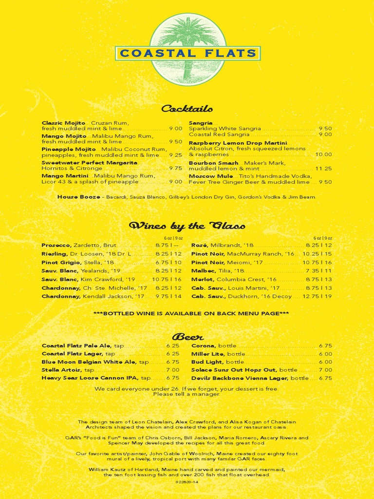 The actual menu of the coastal flats restaurant. Everything on the menu is wonderful and consistent. They're happy to work there. Up to date coastal flats menu and prices, including breakfast, dinner, kid's meal and more. Gar’s “food is fun” team of chris osborn, bill jackson, maria romero, ascary rivera and spencer may developed the recipes for all this.