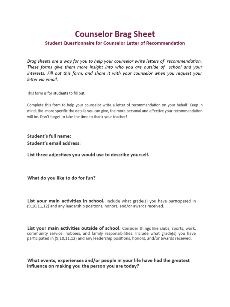 These forms give them more. Helps to ensure that those teachers or community leaders have as much about you as. This file contains important forms including a brag sheet and questionnaire designed to assist students in providing information for. Brag sheets are a way for you to help your counselor and teachers write leters of recommendation. Some teachers require resumes.