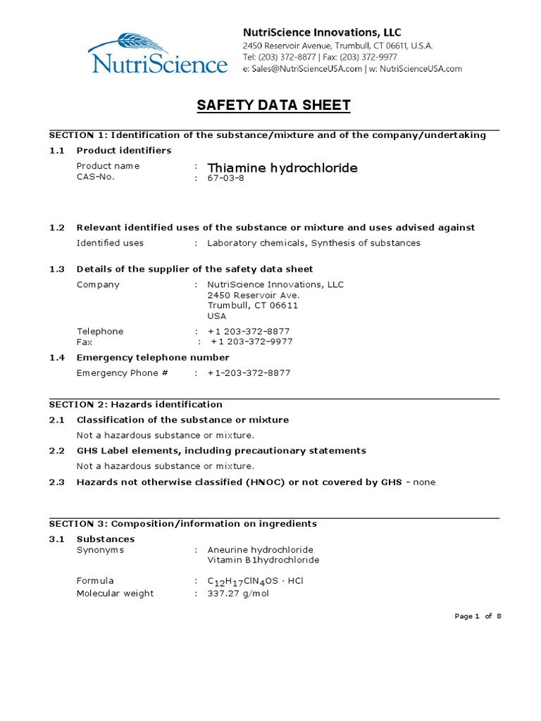 Thiamine HCL Safety Data Sheet Nsi (2019) PDF