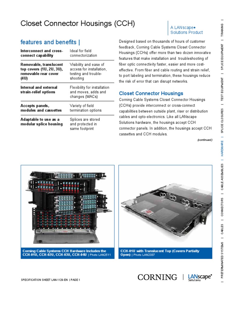 Corning Cch-01U Data Sheet - Documentation labels are provided and components can be added as needed to construct a fiber distribution frame for any. Documentation labels are provided and components can be added as needed to construct a fibre distribution frame for any. Every cch housing is shipped complete with strain relief brackets, routing clips and guides, and mounting brackets for proper installation. Documentation labels are provided and components can be added as needed to construct a fiber distribution frame for any application.