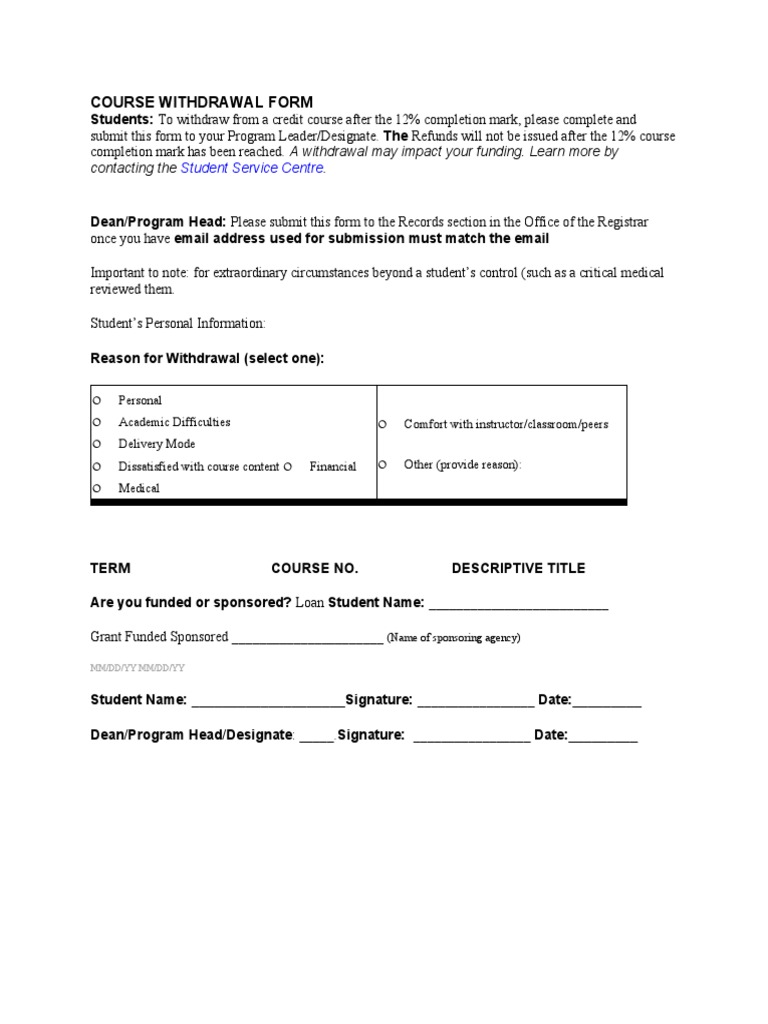 You complete and return the course withdrawal request form and your learning resources, completely undamaged and unmarked, either. A course withdrawal form is an online document used by students to withdraw from a course in an academic institution. This form should be used to withdraw from a single course. By using this online form,.