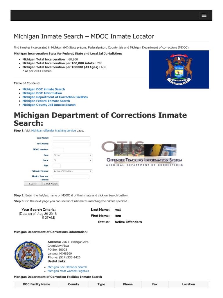 Welcome to the michigan department of corrections’ searchable database, which we call the offender tracking and information. Information about prisoners in county jails or city lockups,. Searching by the number will return information on one prisoner and is the most accurate way to find a particular offender. How to search for inmates in michigan. A search result will provide information.