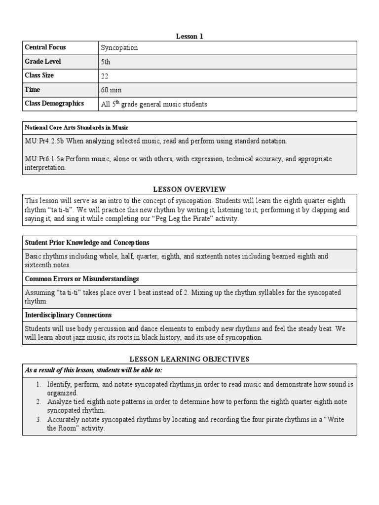 Edtpa Lesson 1 PDF Rhythm Individualized Education Program