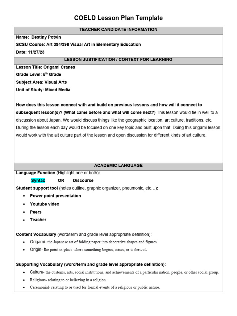 Edtpa Lesson Plan Download Free PDF Origami Lesson Plan