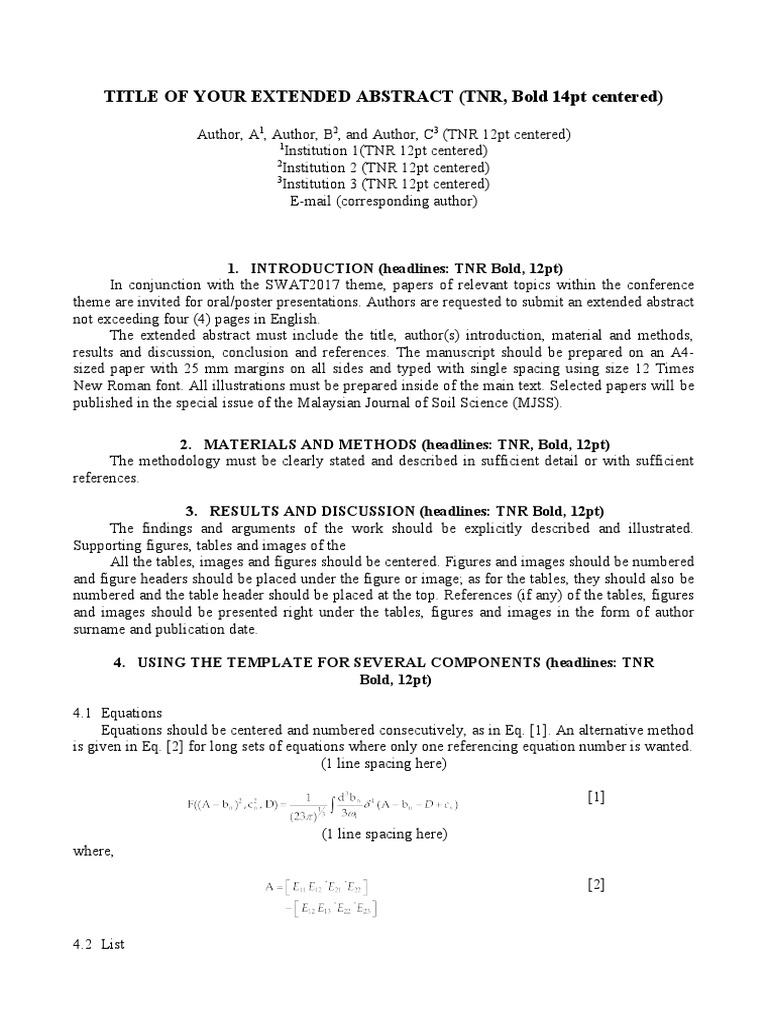 Extended Abstract Format - Extended abstracts can contain figures, tables, formulations or images. The extended abstract should aim to present or encapsulate a complete idea, address a research question, or advance an issue. Main body (including experimental methods, results,. Extended abstracts should be in a structure that explains the. This style guide provides a working example of a properly formatted extended abstract, while also instructing authors how to prepare their. An extended abstract consists of a title; An author byline and affiliation(s);