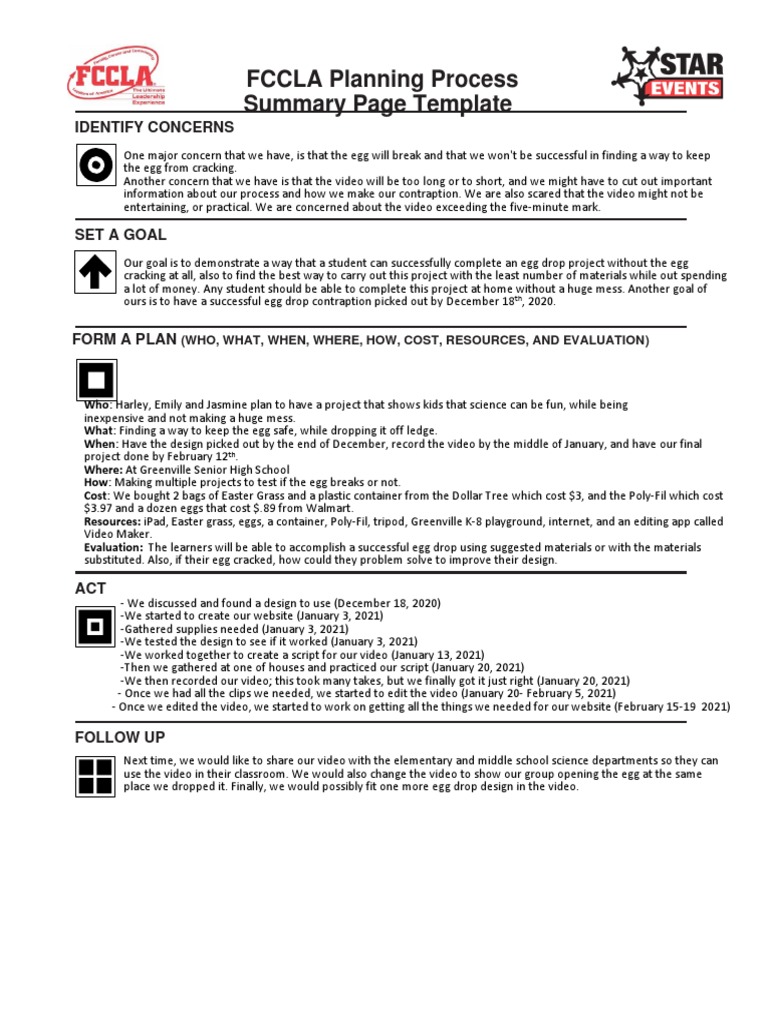 Get a clear mental picture of what you want to accomplish, and write your ideas down as your goal. Fccla planning process identify concerns: Make sure your goal is one that can be. The fccla logo, star events. Planning process summary page (this template may be modified, but all headings must be used in the correct order.