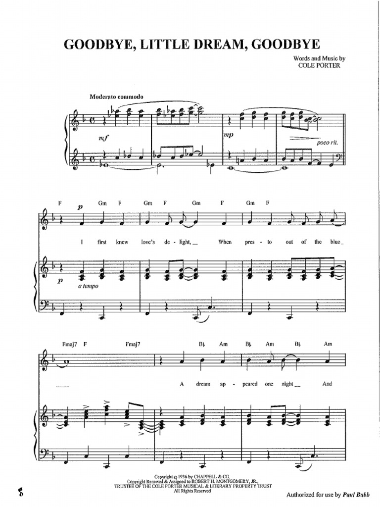 Buy goodbye little dream goodbye by cole porter at jwpepper.com. Browse our 1 arrangement of goodbye, little dream, goodbye. sheet music is available for piano, voice with 1 scoring in 5 genres. Share, download and print free sheet music of goodbye little dream cole porter for piano, guitar, flute and more with the world's largest.