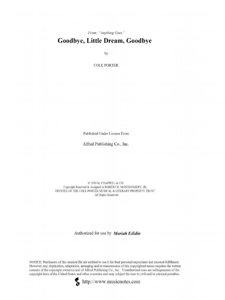 Buy goodbye little dream goodbye by cole porter at jwpepper.com. Share, download and print free sheet music of goodbye little dream cole porter for piano, guitar, flute and more with the world's largest.
