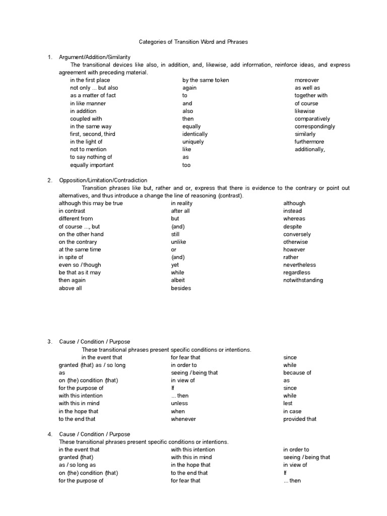 Categories of Transition Word and Phrases PDF Reason Cognitive