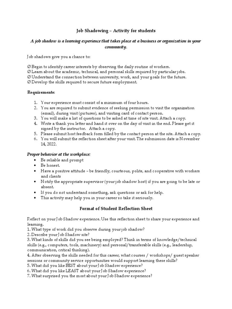 Job shadowing provides valuable insights into a specific profession, allowing. Our job shadowing program offers a variety of documents to assist you in the application and. Job shadowing templates serve as organized frameworks that assist hr. This form requests information from a student seeking to participate in a job shadowing.