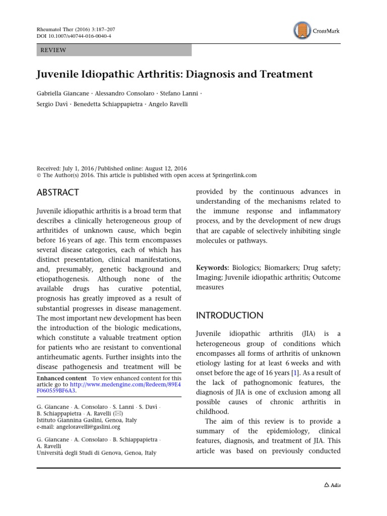 Juvenile Idiopathic Arthritis Diagnosis and Treatment Medical