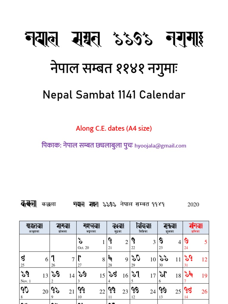 Nepal Sambat 1141 Calendar Along C.E. Dates (A4 Size) PDF