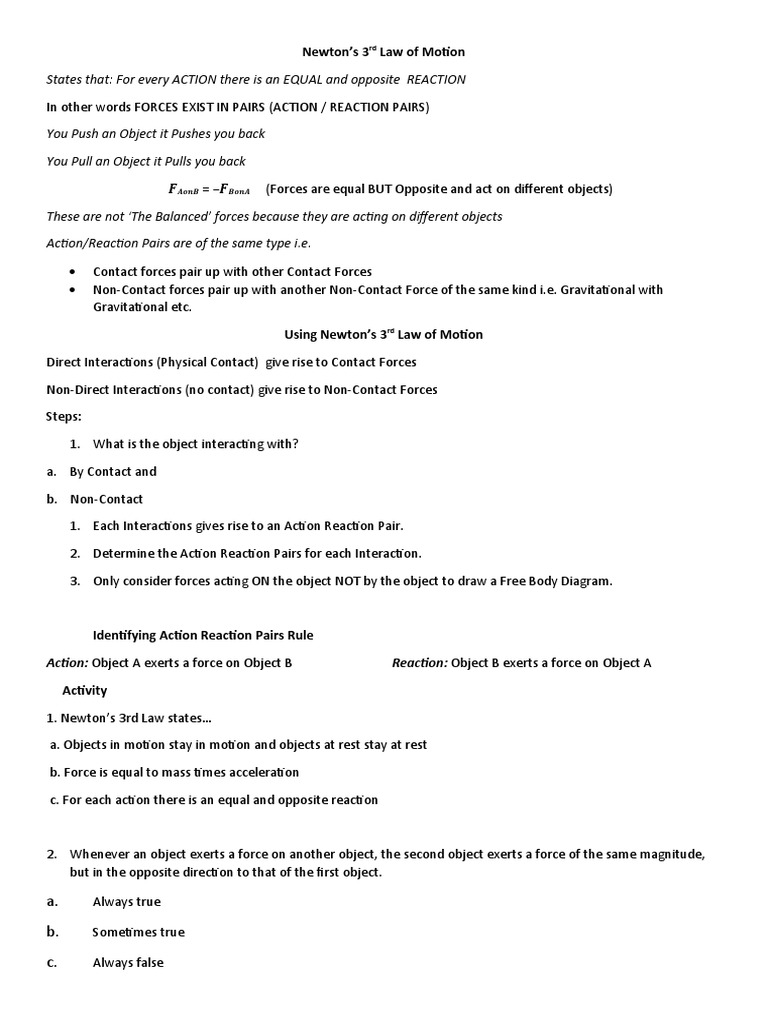 Which of the two forces is greater? Be able to identify the reaction force in a. These worksheets offer a variety of engaging and interactive activities that help students grasp. Apply newtonʼs third law of motion to problems. What is the newtons’s third law b.