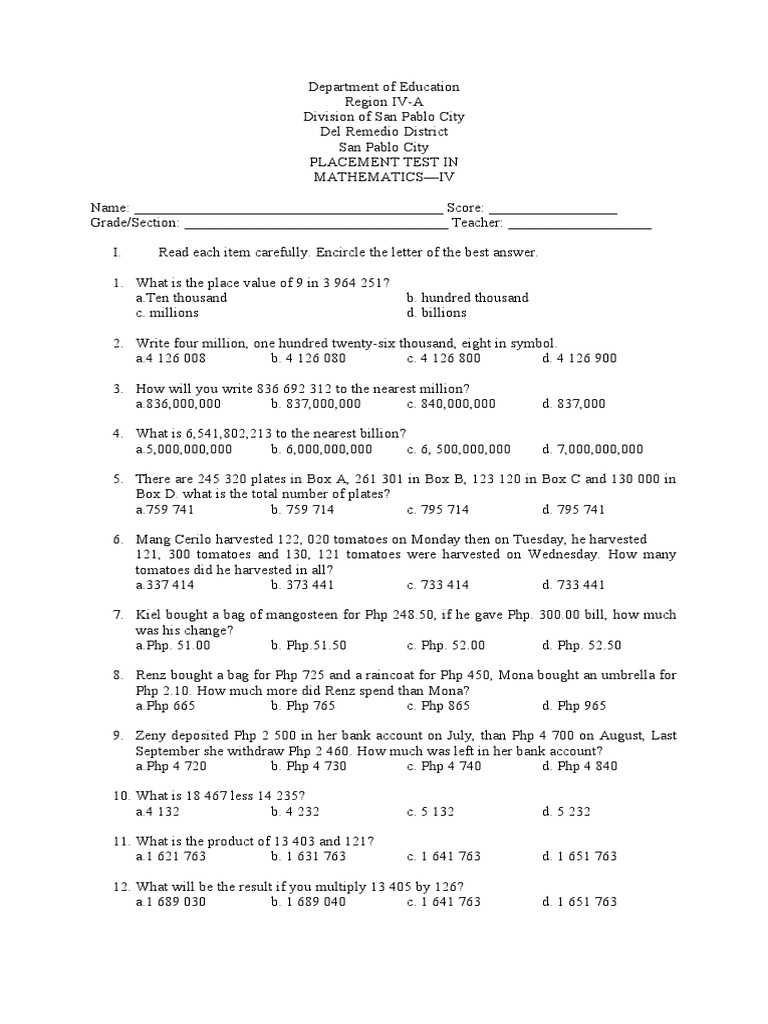 Placement Test PDF Elementary Mathematics Teaching Mathematics