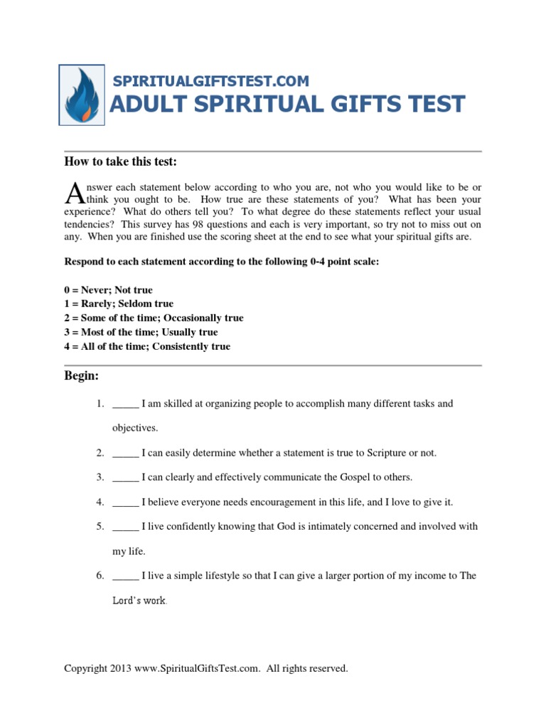 Printable Spiritual Gift Test - Find out what spiritual gifts and talents god has given you with this test that evaluates 28. God has given you one or more spiritual gifts if you are a christian, and discovering that gift or.