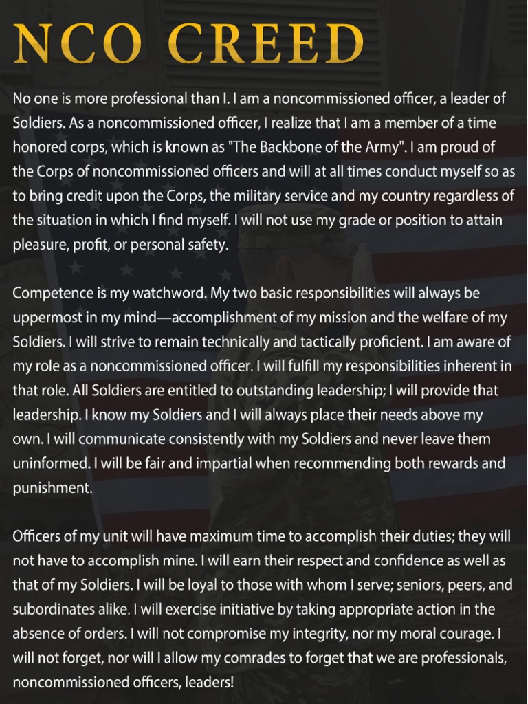 As a noncommissioned officer, i. I am a noncommissioned officer, a leader of soldiers. Nco creed_.f army values no one is more professional than l. The following is the nco creed (non commissioned officer creed)
