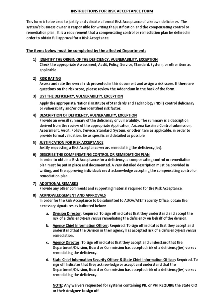 This form is used to justify and validate a formal risk acceptance of a known deficiency in. A form to justify a risk acceptance of a known deficiency in a system or project. Whether you manage a program or event, or are a part of a nonprofit organization, a free risk. The document is a risk acceptance form for a.