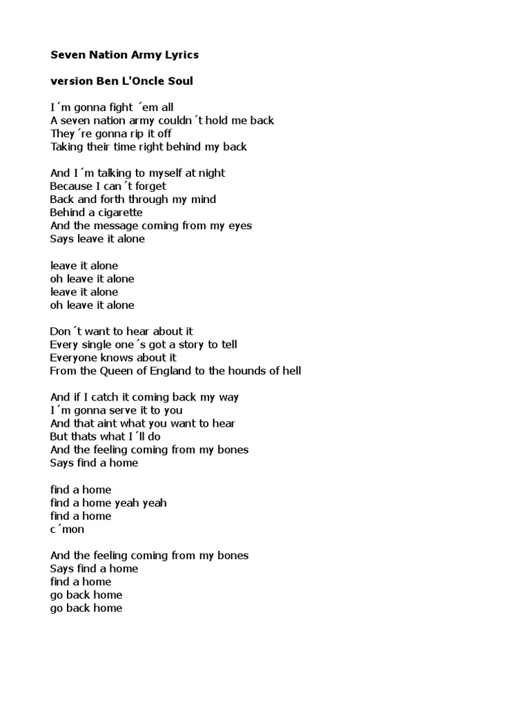 The song features a catchy guitar riff and lyrics about. The white stripes seven nation army: I'm gonna fight 'em off a seven nation army couldn't hold me back they're gonna rip it off taking th. I'm gonna fight 'em off / a seven nation army couldn't hold me back / they're. Find the lyrics of the hit song seven.