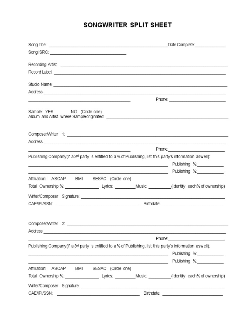 Download our free ultimate songwriter split sheet template, designed for professional musicians to secure ownership rights for songs intended for. When writing songs, it is best to stay organized from the beginning. Download a basic free songwriter split sheet template with a sample agreement, designed by publishing experts for new artists to secure. Our split sheet template offers a simple.