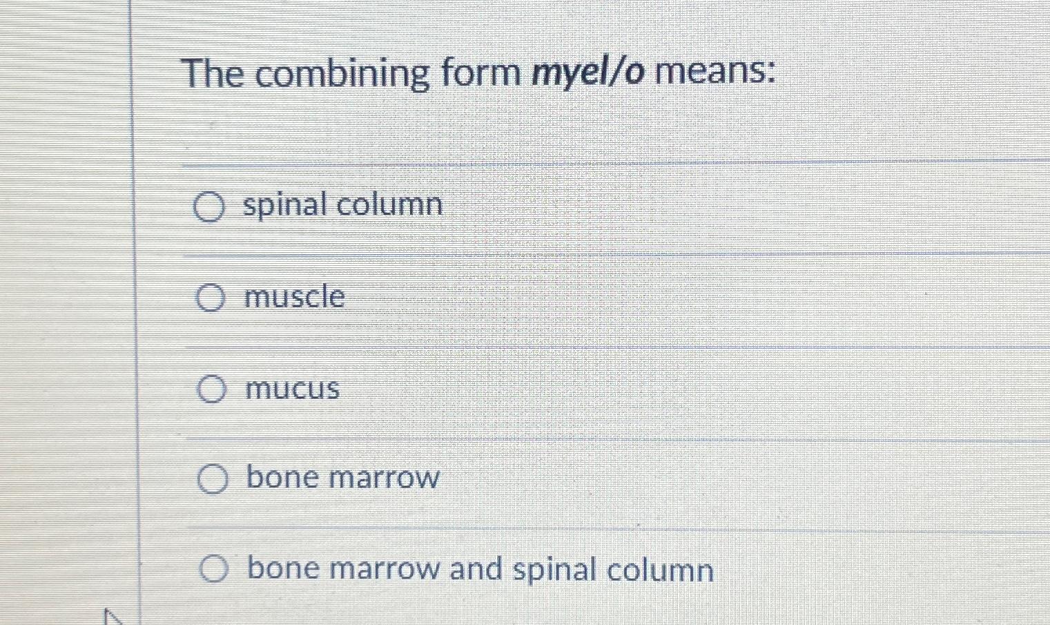 The combining form myel/o means 'bone marrow; Myel/o is a combining form that refers to “spinal cord”. The combining form myel/o is defined as: Spinal cord', indicating its relevance in anatomy. Study with quizlet and memorize flashcards containing terms like the combining form.