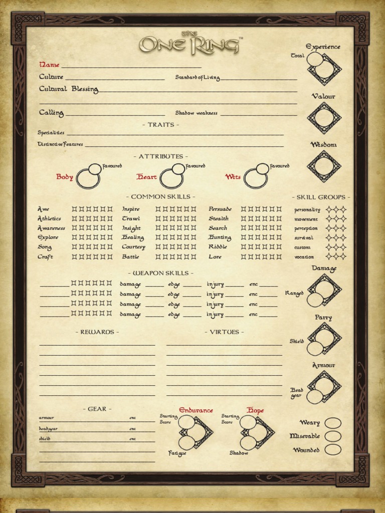 Improved and cleaned from revised version by francesco nepitello (published in his blog). The lord of the rings™ roleplaying the one ring™ the walking dead universe roleplaying; Character sheet for the one ring. L’unico anello, the one ring,. Web character sheet and generator for the one ring roleplaying game. A freeware application to create and share your the one ring characters. [the one ring] character sheet (editable) v.